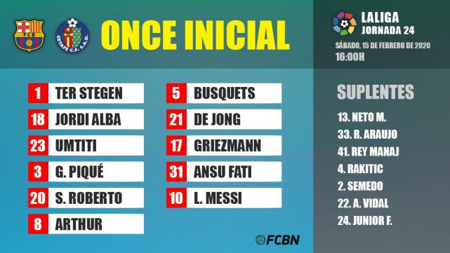• XI of the FC Barcelona: Ter Stegen; S. Roberto, Hammered, Umtiti, Jordi Alba; Busquets, Arthur, Of Jong; Messi, Griezmann and Ansu Fati.