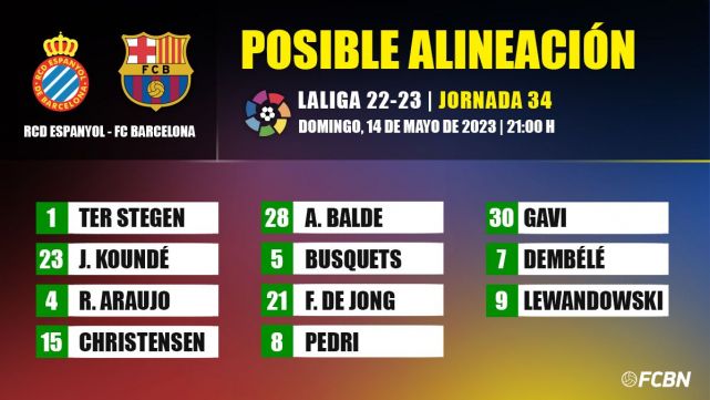 - XI of the FC Barcelona: Ter Stegen; Koundé, Araújo, Christensen, Balde; Busquets, Of Jong, Pedri; Dembélé, Lewandowski and Gavi.