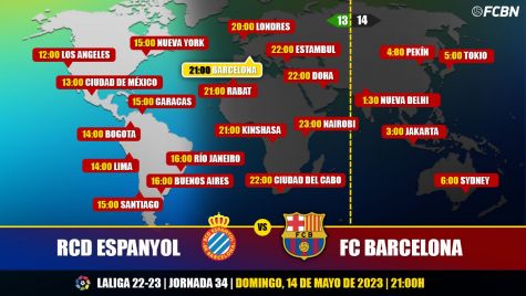 RCD Espanyol and FC Barcelona will meet this Sunday, May 14 at 9:00 p.m. (9:00 PM CEST) at the RCDE Stadium (Barcelona). The match corresponds to the LaLiga Santander 2022-2023 Matchday 34 and pits Espanyol led by Luis García (nineteenth with 31 points) against Barça coached by Xavi Hernández (leader with 82 points). Next, we review the timetables and where to watch this football match on TV.