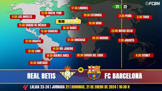 In addition, different International TV channels offer to watch the Real Betis-FC Barcelona of matchday 21 of LaLiga EA SPORTS live through s of their platforms. These are the schedules and television channels that broadcast the Real Betis vs FC Barcelona match live and online, but remember If there is no television in your country, you can follow with us the minute and result here.