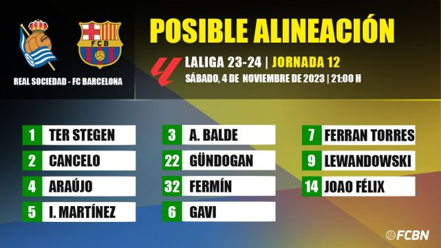 FC Barcelona visits San Sebastián to face Real Sociedad, in the match corresponding to the twelfth day of LaLiga EA SPORTS. There are some doubts about the XI that Xavi Hernández could bet on