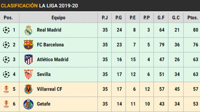 With the zone Champions almost decided, are for resolving the Europe League and the last square of the descent. Athletic and Seville seem inalcanzables in his third and fourth place, as well as the Villarreal in the fifth. By the sixth and the seventh litigate the Getafe and the Real Sociedad, that can not despistar because Valencia, Granada and Athletic Club are to the threaten. The Leganés is to the edge of the abyss and soon could accompany to the Espanyol to the category of silver, whereas the RCD Mallorca treats to give hunting to the own Alavés, to Celtic of Vigo or Eibar.
