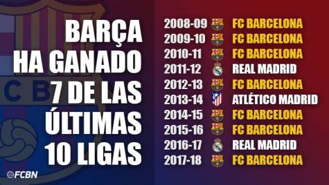 The hegemony of the FC Barcelona in the present championship has not been distant too much of which carries seeing in the last decade, in which the Barcelona have consecrated like the most successful team. The block of the staff has kept and the players have achieved to keep his hunger of victory.