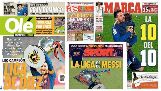 - Daily ACE: "The Tenth of Messi", published the newspaper 'ACE', informing that "the Barça adds the eighth League in eleven years and the fifth in property". The Madrilenian newspaper stood out that Leo Messi "went in after the rest, sentenced and is to two Leagues of Gento", doing reference to the record of Leagues won by an only player in the Spanish football.