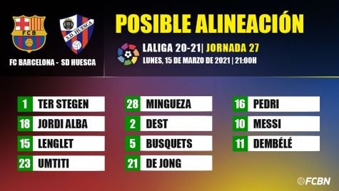 - XI of the FC Barcelona: Ter Stegen; Dest, Mingueza, Umtiti, Lenglet, Alba; Of Jong, Busquets, Pedri; Dembélé and Messi.