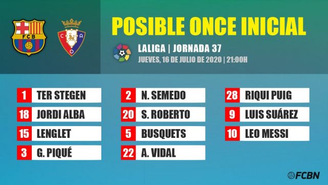 - FC Barcelona: Ter Stegen, Jordi Alba, Lenglet, Hammered, Semedo, Busquets, Arturo Vidal, Sergi Roberto, Riqui Puig; Leo Messi and Luis Suárez.