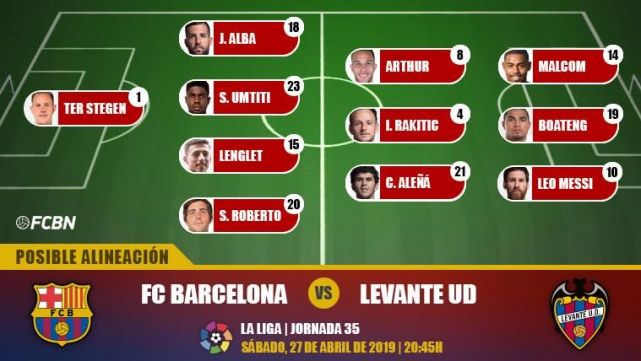 FC Barcelona: Ter Stegen; Sergi Roberto, Lenglet, Umtiti, Alba; Aleñá, Rakitic, Arthur; Messi, Boateng and Malcom.