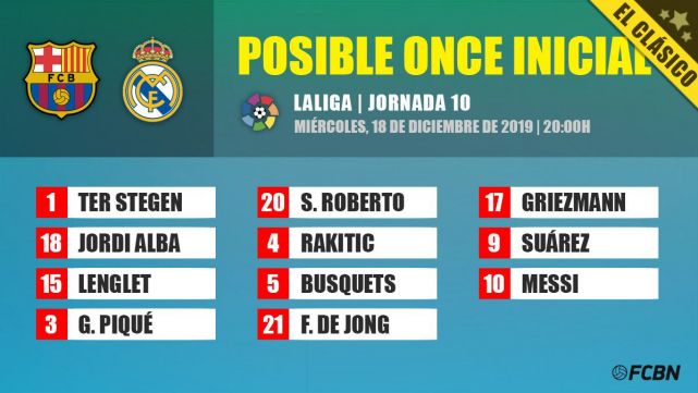 - FC Barcelona: Ter Stegen; Jordi Alba, Lenglet, Hammered, Sergi Roberto; Rakitic, Busquets, Of Jong; Griezmann, Leo Messi and Luis Suárez.