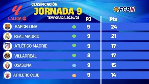 The ninth day of LaLiga EA Sports 2024/25 closed this Sunday with Atlético de Madrid's draw in Anoeta against Real Sociedad (1-1). A goal by Luka Susic in the 84th minute prevented the 'colchoneros' from adding the 3 points, which means they remain in third place in the standings with 17 points, seven behind the leader, FC Barcelona (24) and 4 behind Real Madrid (21). The culés regained the lead on their own thanks to another solid win away from home, this time against Alavés (0-3).