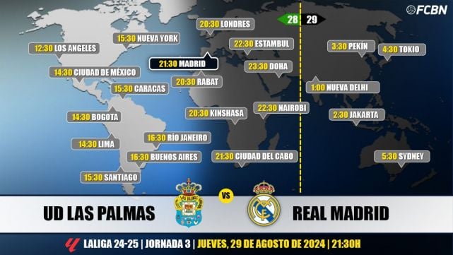 UD Las Palmas and Real Madrid face each other this Thursday, August 29, starting at 9:30 p.m. (9:30 PM CEST) at the Gran Canaria Stadium (Las Palmas). The match corresponds to matchday 3 of LaLiga EA SPORTS 2024-2025 and pits UD Las Palmas, coached by Luis Carrión, against Carlo Ancelotti's Madrid. Below, we review the schedules and where to watch this soccer match on TV.