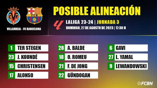 - XI of the FC Barcelona: Ter Stegen; Koundé, Christensen, Alonso, Balde; Romeu, Of Jong, Gündogan, Gavi; Yamal and Lewandowski.