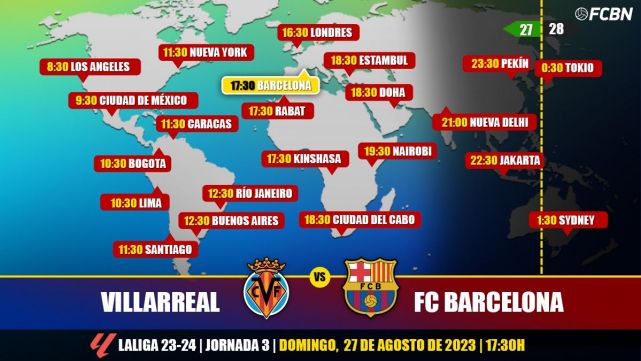 In United States, the party of LaLiga EA SPORTS 2023-2024 between Villarreal and FC Barcelona can see live from the 11:30 hours (12:30 PM, Washington) and the 8:30 (8:30 AM, Los Angeles) through ESPN Sports, ESPN App and ESPN+. In Sudamérica, Centroamérica, Caribbean, Mexico and Brazil, the party Villarreal vs FC Barcelona will be able to see live through the following schedules and channels of television: Star+, ESPN, DGO, DSPORTS, Tigo Sports, Tigo Sports App, Tgo Sports+ and SKY Sports.