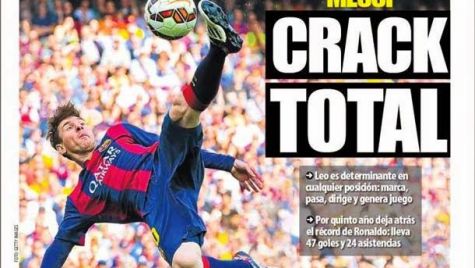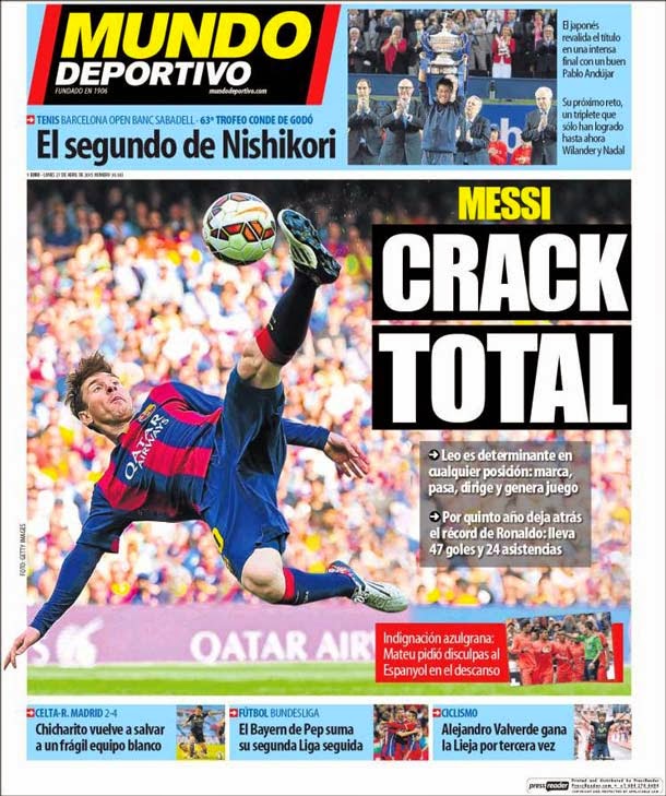 Cover of the periodic Sportive World, Monday 27 April 2015. Leo Messi is determinant in any position: mark, raisin, directs and generates game. By fifth year leaves backwards the record of Ronaldo: it carries 47 goals and 24 assistances.