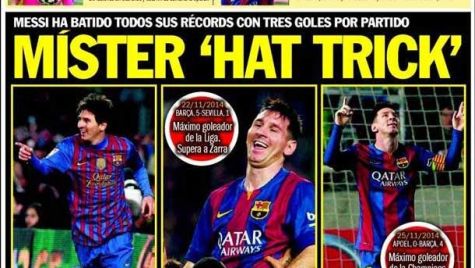 Cover of the newspaper Sport, Thursday 27 November 2014. Messi has beaten all the records with three goals by party. | Vermaelen, a clinical case: 20 injuries in three years.