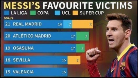 Although Messi already has marked to almost all the teams with which has confronted the Barça, five of them are especially favourable. The Real Madrid has the honour to be the team more goleado by Leo, the one who already has marked 21 goals to the eternal rival (14 in League, 5 in the Supercopa of Spain and 2 in the Champions league). The second victim preferred of the Argentinian is the current champion of League, the Athletic of Madrid. The team "colchonero" has received 20 so many by part of Messi (17 in League and 3 in the Glass).