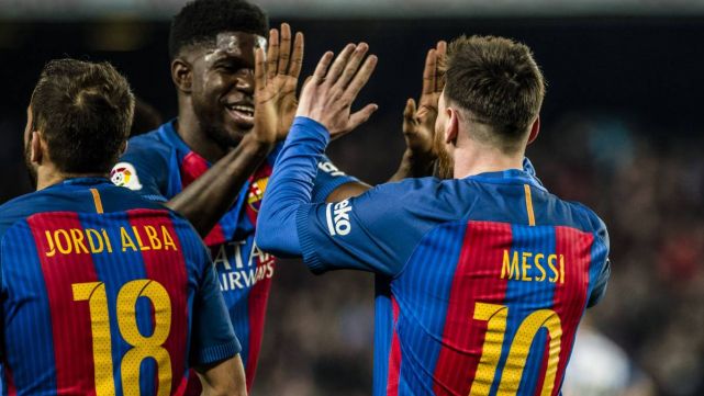 Samuel Umtiti and Lionel Messi celebrate a goal of the Barça