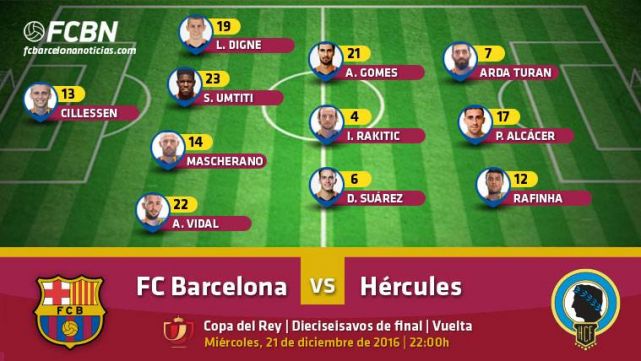 The FC Barcelona confronts to Hercules in the turn of the dieciseisavos of final of the Glass of the King 2016-17. Luis Enrique, that gave holidays anticipated to five indisputable headlines, has made the best possible alignment