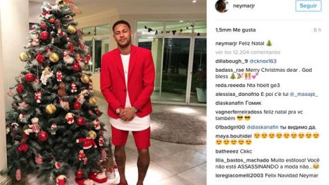 In the photography published by Neymar Jr, the Brazilian footballer appears dressed with some short trousers and an American of red colour, a white T-shirt below and some zapatillas also of a red intense, to the purest style "Dad Noel" and luciendo tattoos in the legs.