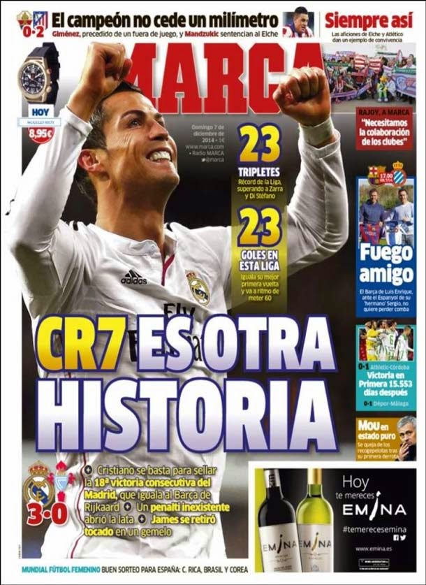 Cover of the newspaper Marks, Sunday 7 December 2014. Cristiano suffices to seal the 18ª consecutive victory of the Madrid, that equalises to the Barça of Rijkaard. A penalti non-existent opened the tin and James withdrew touched of a twin.