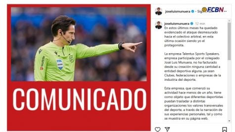 "In recent months, the excessive attack on the refereeing collective has become evident, with me being the protagonist in this latest instance. The company Talentus Sports Speakers, in which referee José Luis Munuera is a stakeholder, has not billed any amount to any sports entity, whether clubs, federations, or companies in the sports industry since its inception.