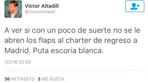 After publishing a tuit controversial in which it finish wishing that the aeroplane of the Real Madrid crashed , the journalist Víctor Altadill was sacked of his place of work in "International Radio". Although it treated to erase the writing, already was too late