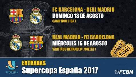 Ya están a la venta las entradas para los dos enfrentamientos entre el FC Barcelona y el Real Madrid en la Supercopa de España 2017. El partido de ida, el Barça-Real Madrid, se juega en el estadio del Camp Nou el domingo 13 de agosto a las 22:00 horas. Y el partido de vuelta, el Real Madrid-Barça, se juega en el Estadio Santiago Bernabéu el miércoles 16 de agosto a las 23:00 horas.