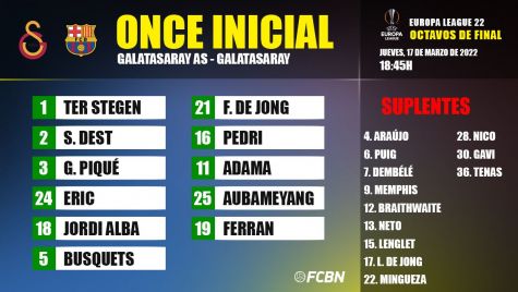 Xavi Hernández ya ha revelado la alineación con la que el FC Barcelona enfrentará al Galatasaray en la vuelta de los octavos de final de la Europa League 2021-22. Este es el XI del Barça: Ter Stegen; Dest, Piqué, Eric, Alba; Busquets, De Jong, Pedri; Adama, Aubameyang y Ferran