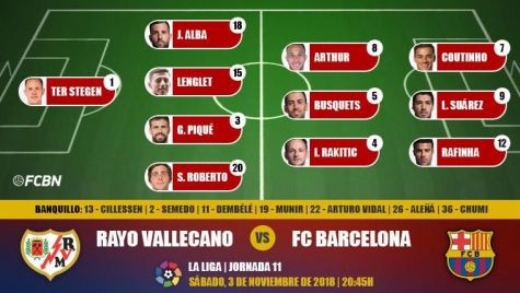 Tras recuperar ventajas y confianza, el FC Barcelona sigue de examen en LaLiga. Ahora debe empezar a probar su valía fuera de casa, y empieza la prueba sin rotaciones frente al Rayo Vallecano. Estos son los once titulares elegidos por Ernesto Valverde