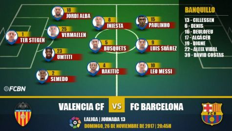 En Mestalla, el Barça buscará mantener su condición de invicto resistiendo a la velocidad del ataque valencianista. Con un centro del campo preparado para imponerse en la presión a los rivales, Valverde no presenta sorpresas en los retoques obligados que requería el once titular. La pareja de centrales será para Samuel Umtiti y Thomas Vermaelen, y Paulinho reforzará la medular, ganando el duelo a un Paco Alcácer que deberá esperar su oportunidad desde el banquillo.