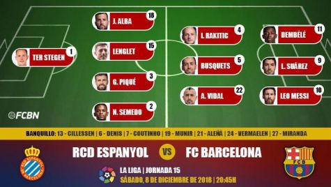 El FC Barcelona quiere ampliar su ventaja en el liderato de LaLiga, y para ello debe saldar con victoria el derbi frente al RCD Espanyol. Estos son los once titulares elegidos por Ernesto Valverde para el duelo: Ter Stegen; Semedo, Piqué, Lenglet, Jordi Alba; Arturo Vidal, Busquets, Rakitic; Dembélé, Suárez y Messi