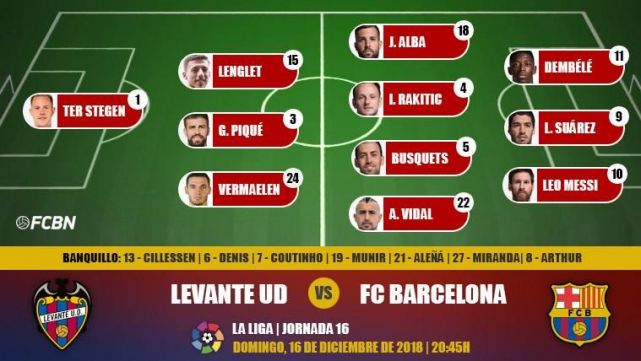 Estos son los once jugadores titulares del FC Barcelona para el duelo contra el Levante de la decimosexta jornada de LaLiga Santander: Ter Stegen; Piqué, Lenglet, Vermaelen; Rakitic, Vidal, Busquets, Alba; Dembele, Messi y Suárez
