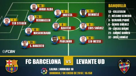 Vuelve LaLiga en 2018 y lo hace con un FC Barcelona-Levante en el Camp Nou. Ernesto Valverde se toma a todos lo rivales muy en serio, y no ha reservado nada a pesar del importante partido de Copa del jueves. Estos son los once titulares para el partido
