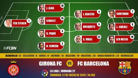 Nueva semana y mismos deberes, porque el Barça mira al Girona en LaLiga con una remontada pendiente en la Copa del Rey. Estos son los once titulares elegidos por Ernesto Valverde para el duelo: Ter Stegen; Semedo, Piqué, Lenglet, Jordi Alba; Arturo Vidal, Busquets, Rakitic; Messi, Suárez y Coutinho
