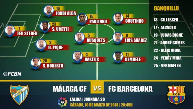 Alineaciones de la J28 de LaLiga: Málaga-FC Barcelona