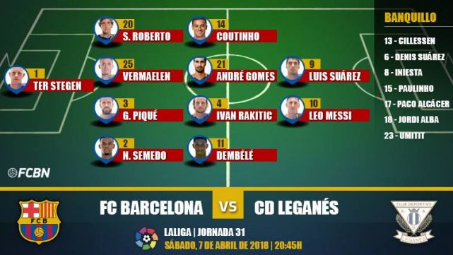 El FC Barcelona llega a otra parada decisiva por LaLiga y no debe dejarse distraer ni por el derbi madrileño ni por la Champions. Para hacer bueno el empate contra el Sevilla toca ganar al Leganés en un duelo con muchas rotaciones. Estos son los once titulares