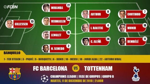 El FC Barcelona despide la Champions en 2018 con los deberes hechos contra un Tottenham que se la juega en el Camp Nou. Estos son los once titulares elegidos por Ernesto Valverde para el duelo: Cillessen; Semedo, Lenglet, Vermaelen, Miranda; Aleñá, Rakitic, Arthur; Dembélé, Munir y Coutinho.