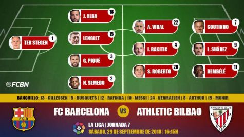 XI del FC Barcelona: Ter Stegen, Semedo, Piqué, Lenglet, Jordi Alba; Rakitc, Sergi Roberto, Vidal, Coutinho; Suárez, Dembéle.