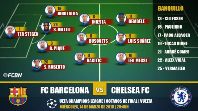 Sacó un valiosísimo empate de Stamford Bridge, pero ahora el FC Barcelona debe rematar la faena y confirmar su superioridad frente al Chelsea. El camino a los cuartos de final de la Champions pasa por el Camp Nou. Estos son los onces titulares