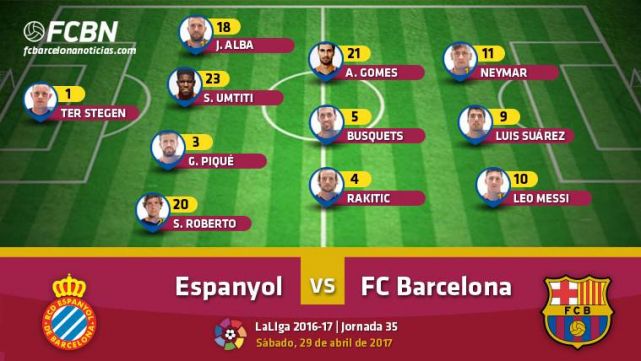 Y para el duelo el FC Barcelona llega con algunas bajas relevantes como Rafinha Alcántara, Aleix Vidal, Mathieu y Andrés Iniesta por lesión, en el caso del manchego baja de última hora por molestias en el abductor. Ante esto no toca otra que salir con el mejor equipo posible para intentar doblegar al conjunto "perico" en el "derbi" catalán.