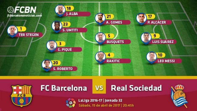 Luis Enrique tendrá la importante baja de Neymar contra la Real Sociedad, y además realizará algunas rotaciones para recibir a la Real Sociedad. Messi y Luis Suárez mandarán en ataque, mientras que André Gomes vuelve al medio campo