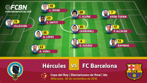 Tras el nuevo mal resultado cosechado en Anoeta contra la Real Sociedad, los de Luis Enrique buscan recuperarse anímicamente de sus irregularidades deportivas sentenciando, si es posible, la eliminatoria de dieciseisavos de final de Copa del Rey contra el Hércules en Alicante. Luis Enrique hará debutar en partido oficial a algunos jugadores del filia, pero sobre todo aprovechará para dar minutos a los jugadores menos habituales del primer equipo. Cabe destacar el regreso de Samuel Umtiti, ya recuperado de su lesión.