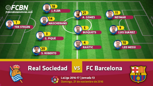 Tras el empate ante el Málaga CF y la victoria ante el Celtic de Glasgow, los de Luis Enrique buscan mantener la distancia con el Real Madrid en la cima de LaLiga 2016-2017. Pero para ello necesitan vencer en un campo maldito como Anoeta, donde los culés llevan seis años sin ganar ante una Real Sociedad encaramada en puestos europeos y con una racha de cuatro victorias consecutivas. Es por todo ello que Luis Enrique no se ha reservado nada y ha salido con su once de gala pero con la única ausencia del lesionado Andrés Iniesta