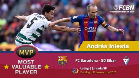 El capitán del FC Barcelona, Andrés Iniesta, es el elegido como MVP del partido ante la SD Eibar, después de su exhibición, lucha, pases y liderazgo durante todo el partido. Al manchego se le vio entonado y será un referente en la final de Copa