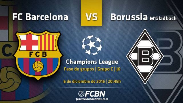 El FC Barcelona quiere despedirse del Grupo C de la liguilla de la UEFA Champions League 2016-17 ganando, recuperando las buenas sensaciones y mejorando la química del equipo, con el objetivo de mejorar anímica y futbolísticamente de cara a los próximos compromisos de Copa del Rey y Liga Santander. Para ello, deberá afrontar un partido intrascendente en lo que respecta a resultados ante un conjunto, el Borussia Mönchengladbach, que no vendrá a pasearse al Camp Nou, sino que hará todo lo por también mostrar una buena imagen a pesar de no jugarse nada al estar clasificado para las eliminatorias de la UEFA Europa League a partir del año 2017.