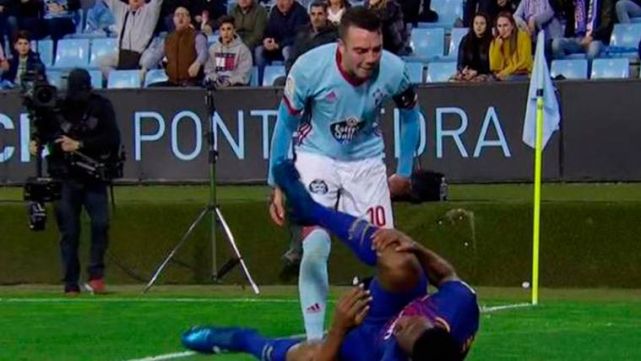 Aspas mantuvo una intensa pugna con Yerry Mina a lo largo del encuentro, y al comienzo de la segunda parte hubo una jugada que llamó la atención. El jugador del Celta arrolló a Yerry Mina y, tras derribarle, le recriminó algo durante varios segundos, cuando el futbolista azulgrana se encontraba en el piso. No han trascendido las palabras de Aspas a Mina, pero no han sido pocos los seguidores colombianos que se han encargado ya de llamar "racista" a Iago Aspas a través de las redes sociales por lo ocurrido.