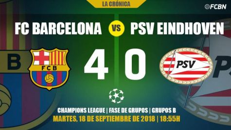 El FC Barcelona comenzó la Champions League 2018-19 de manera inmejorable, goleando al PSV Eindhoven en el Camp Nou. Los azulgranas tuvieron ciertos problemas en el primer tiempo, pero pronto apareció Leo Messi para solventarlos con un golazo de falta. Dembélé y el propio Messi -que marcó tres goles- sentenciaron el encuentro y colocaron al Barça líder del grupo B, tras la victoria de Inter de Milán por la mínima ante el Tottenham (2-1).