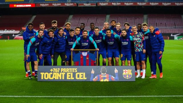 Desde las redes sociales el equipo azulgrana ha dado muestras de su grandeza y ante el Valladolid, partido que se está jugando este lunes, recibió un homenaje en compañía de sus familiares, así como los demás miembros del club, que posaron junto a Messi para una foto que quedará en la eternidad.