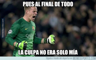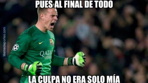 Otra vez, y a pesar de no haber sido titular, el mejor ?meme? de un partido del FC Barcelona llega protagonizado por el portero Marc-André ter Stegen. Cuando todos lo culpaban a él por no haber conseguido dejar la portería a cero, Bravo encajó dos tantos ante el Sevilla