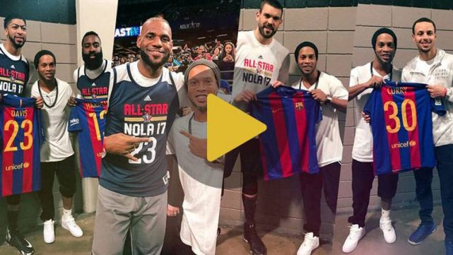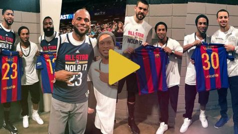 Ronaldinho Gaúcho ejerció de embajador del FC Barcelona estos últimos días en Nueva Orleans (Estados Unidos), donde se celebró el All-Star de la NBA, y se fotografió y regaló camisetas culés a la mayoría de grandes estrellas de la competición
