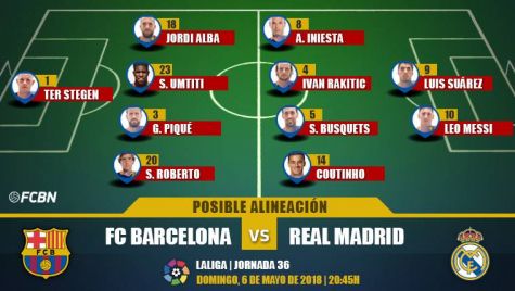 El FC Barcelona se enfrentará con sus mejores jugadores al Real Madrid. Ernesto Valverde elaborará una alineación en la que la gran incógnita estará en Andrés Iniesta, Philippe Coutinho y Ousmane Dembélé, que se disputarán dos posiciones del once